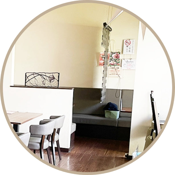 これも、カフェら・さぼうるに来ていただいたお客様に、周りを気にせず「ゆっくりと過ごしていただ きたく場所を提供したい」という想いで設計しているからです。玄関へのアプローチもスロープとなっ ており、ほぼバリアフリーの設計としていますので、車椅子やベビーカーでご来店のお客様もゆっくり、ゆったりとご利用いただけます。